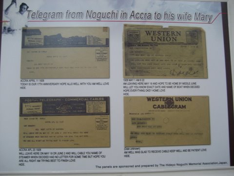 Leaving the Institute, we headed to next destination, the laboratory used by Hideyo Noguchi 82 years ago. HIH Crown Prince has been here just a day before. The lab is part of the University Hospital of University of Ghana in Accra city, separate from the Legon campus. I noticed the signatures of HIH Prince and Princess Takamado in the guest book dated 1993. What was it like to be here 80 years ago, I wonder. Among the exhibition was a telegram sent from Hideyo to his wife in New York City. The telegram was sent by