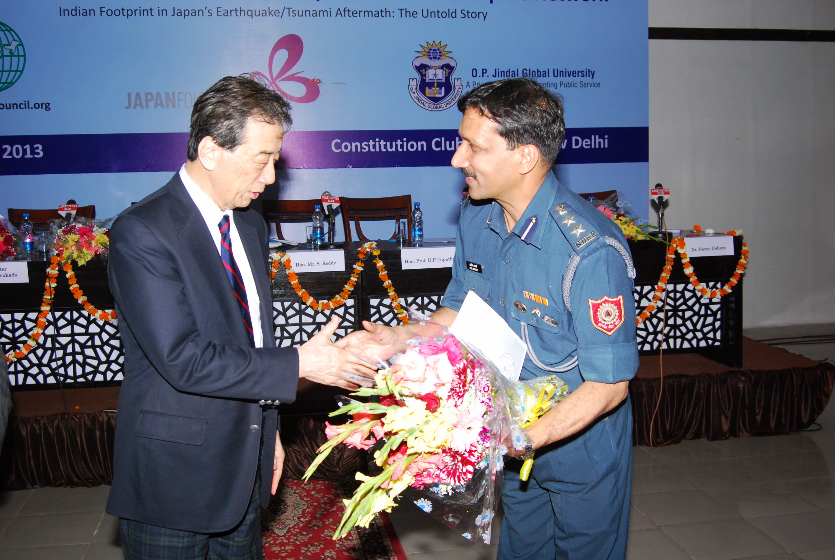 The Indian government’s NDMA is an organization separate from the fire department, police, and military, and is composed of 11,000 people deployed in ten locations. After the March 2011 Great East Japan Earthquake and Tsunami, under the leadership of Commandant Alok Avasthy, a team of about fifty were dispatched to the town of Onagawa in Miyagi Prefecture, and were active in the first stages of disaster relief. We expressed our feelings of gratitude and greeted each member of the team, and gave my powerpoint presentation to Commandant Avasthy.