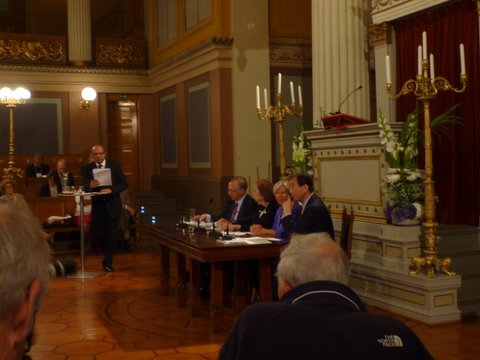 After arriving, I checked in at the Grand Hotel Oslo. This is a historic hotel where it is a tradition for the Noble Peace Prize Laureates to stay and to greet the crowd from the second floor balcony, which faces the park. I had a light, late dinner with Norway’s Ambassador to Japan, Mr. A. Walther, at a nearby restaurant close to the National Theater.