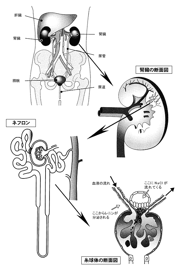 それでね、おもしろいことには、ネフロンは片方の腎臓に100万もあるんだけど、自分のおしっこを作ってくれた糸球体のところに尿細管がまたくっついていて、必ずもう1回糸球体のそばにおしっこが戻ってくる。どういうことかというと、この腎臓とネフロンのイラストを見てください。糸球体にもう一度ネフロンが戻ってきているところに流れてくるNaCl、特にClがシグナルで、糸球体に入ってくる血管の一番最後の血管平滑筋なんだけど、ここでレニンを作っている。ここのClがちょっとでも減るとね、すっとレニンがでてくる。これが最近わかってきたんだ。これは、東北大学第2内科の伊藤貞嘉教授たちやミシガン大学グループが直接証明したんだ。Clがちょっとでも動くとレニンがポンとでてくる。だから食塩摂取がちょっとだけ減ると、「Clが少し減るな」ということでレニンをポンと出す。逆に食塩がちょっと増えるとレニンを抑えるということをしている。例えば食塩の摂取量を今極端なことをやって毎日10グラムから6グラムぐらいに落とすと、ちゃんと2、3日後にはもう6グラムずつしかでない。そしてそれ以上細胞外液は減らない。血圧を測るとなんにも違っていない。見ためには何も変わってないんだけど、非常に微妙なシグナル系があって、RAAS系が少し変化しているんだ。だってそうじゃない、食塩摂取が毎日10グラムから6グラムに減ったとしたら、やっぱり3、4日後には尿中排泄量が6グラムになってないとバランスがとれなくなっちゃう。過不足なくやりながら、また新しい平衡状態ができてるんだよ。