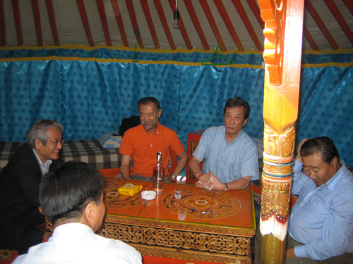 Mongol018 ゲルの中で、右からチャドラ会長、私、唐木さん、西ヶ廣局長