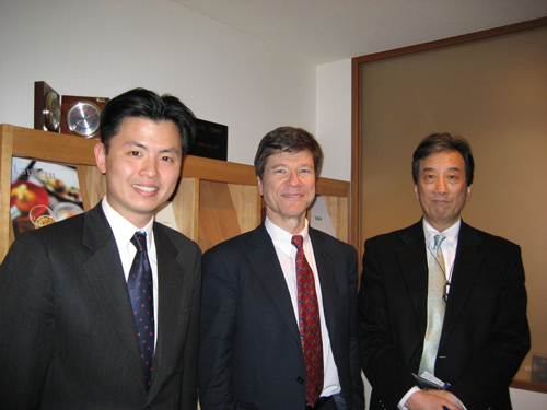 Sachs氏の滞在は短かったのですが、財務大臣、厚生労働大臣、同副大臣(武見さん)、緒方貞子JICA理事長、外務省高官等々にお会いいただきました。更に私の司会で、住友化学の米倉社長との対談(日経新聞掲載)のほかに、いくつかのインタービューを受けられ、大変喜んでいただいた3日間でした。関係者の皆さんのご支援に心から感謝します。また、ところどころでこれらの記事をご覧になられていると思います。写真はSachs氏とNPOの同僚のジェームス近藤さんと、私です。