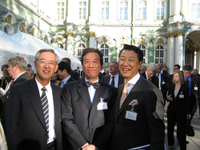 写真 7: Hermitageの中庭で一ツ橋ビジネススクール竹内教授(向かって右)と帝人の長島社長