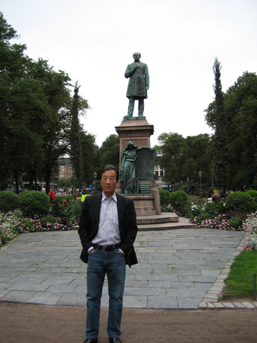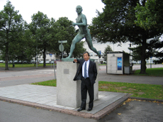 Helsinki007写真7  歴史的長距離ランナーのヌルミ像のまえで(Olympic長距離で9つの金、3つの銀メダルをとった伝説のランナーです