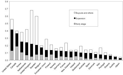 図2: ベンチャーへの乏しい資金供給量–その2:諸国でのステージ別ベンチャー投資(GDP比)(1998-2001)