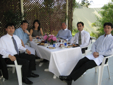 Img_0888 写真4 大使公邸の庭のテラスでオムライスのご馳走。左から、是永さん、私、余路さん、波多野大使、斉藤さん、野村さん
