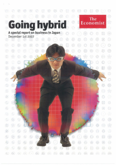 The Economistでは、表紙に「A 14-pages special report on business in Japan」とあり、特集のはじめに「Going Hybrid」(写真1)とあります。5つの報告のタイトルは 1)Message in a bottle of sauce; 2)Still work to be done; 3)Not invented here; 4)No country if an island; and 5)JapAnglo-Saxon capitalism (スペルの間違いではありません!でも、これ本当?)となっています。