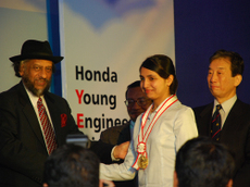 写真1 表彰式で。左からHonda Siel Cars India 武田川社長、私、Pachauriさん(※)、本田財団の伴さん