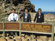 写真5 喜望峰。私の後ろへまっすぐが南極方向。左から日立の岡田さん、八丁地さん