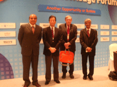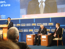 李明博大統領の挨拶(写真1)に始まり、ゲストのリストは素晴らしいものでした。FinlandのAhoさんにもお会いしましたが、彼の発言を聞いていても、ここでも抜け出ている政治のリーダーだと思いました。Wall Street発の金融恐慌、世界不景気の影が忍び寄る中、New Yorkとライブ討論。また、Virgin AirlineのRichard Bransonもテレビで登場しました。