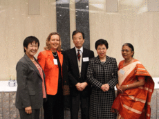 写真1: 左端からUNFPA Tokyo OfficeのMs. Ikegami、UNFPA事務局次長Dr. Mari Simonen、 私、WHO Director General、Dr. Margaret Chan、Academy for Nursing Studies and Women’s empowerment Research Studies 事務局長 Dr. M Prakasamma。