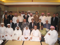 写真; Khalifa大学の学生さん、慶応大学の先生、三菱重工の方、波多野大使と。白い服の方たちがUAE国籍の学生さんです。この服はKandura、というようです。