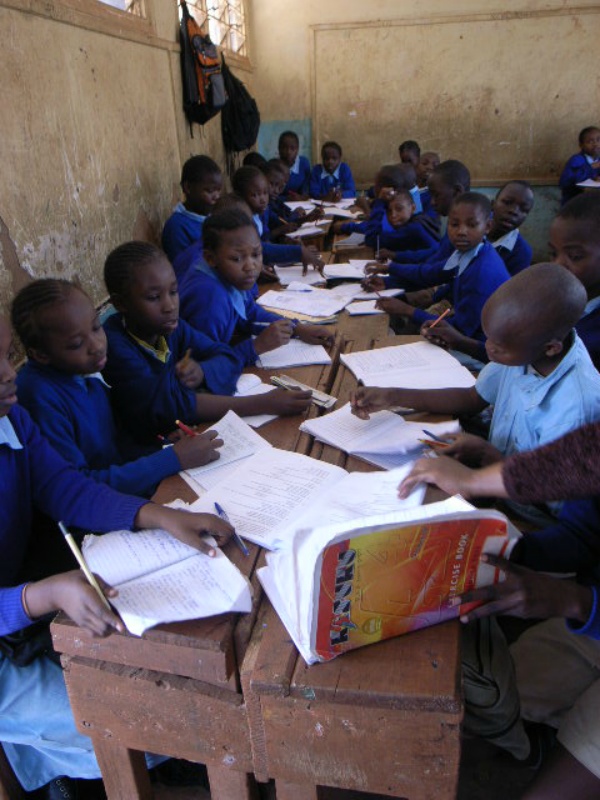 この10年間で、生徒の数も1700人程度から3000人ほどに増えており、先生の数は26人でとても大変そうです。教室いっぱいの生徒たち、1冊の教科書(家に-といってもスラムの中です-教科書はもって帰れません)を6~8人程度で一緒に使いながら勉強しています。電灯もないのでずいぶん暗い部屋もありますが、部屋に一杯の生徒たち。1クラスに70~90人ほどの生徒ということです。