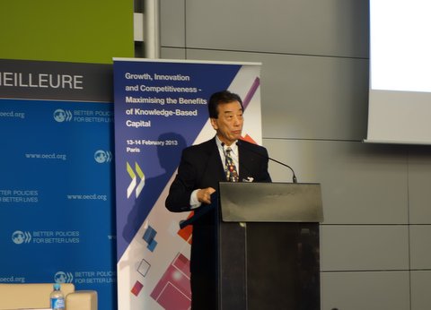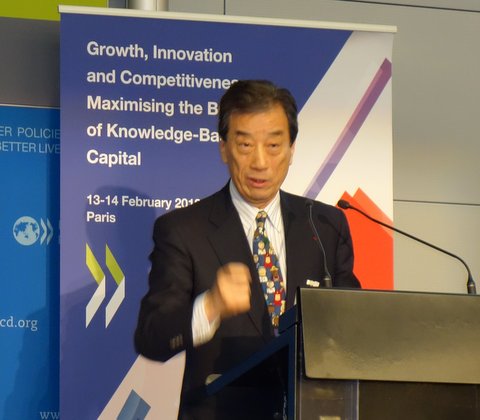 翌日はOECD会議です。私は始まりのパネル、英国 Willetts大臣とSwedenのLjung大臣、そしてUSのLandefeldさんもご一緒で、司会はOECDのWyckoffさんです。ついつい立ち上がって10分ほど。参加者は主として官庁や政策の方たちのようなので、今の世界が大変化を起こしているという産業革命以来の大変化なのではないか、というプレゼンをしました。スライドは2枚、MIT Media LabのJoi Ito所長と三菱総研の小宮山理事長のスライドを修飾したものをお見せし、コピーを配布しました。