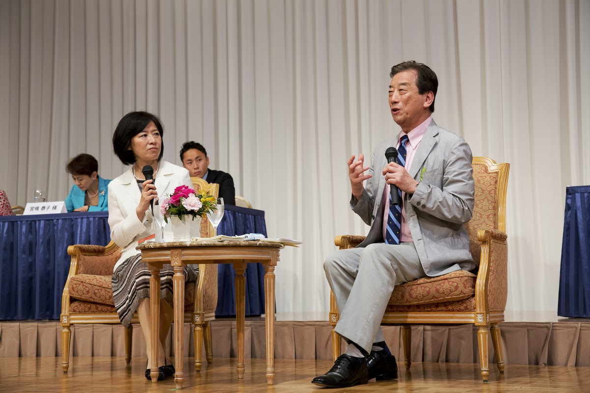 大勢の、特に若い女性が多く、一日中の充実したプログラムです。主催の佐々木さんの挨拶に始まり、キャシー松井さん、二人の女性大臣で弁護士、子育ての森さんと稲田さん、横浜市長の林さんの説得力あるお話などのあと私の翁さんの対談。午後もいろいろなセッションがありました。