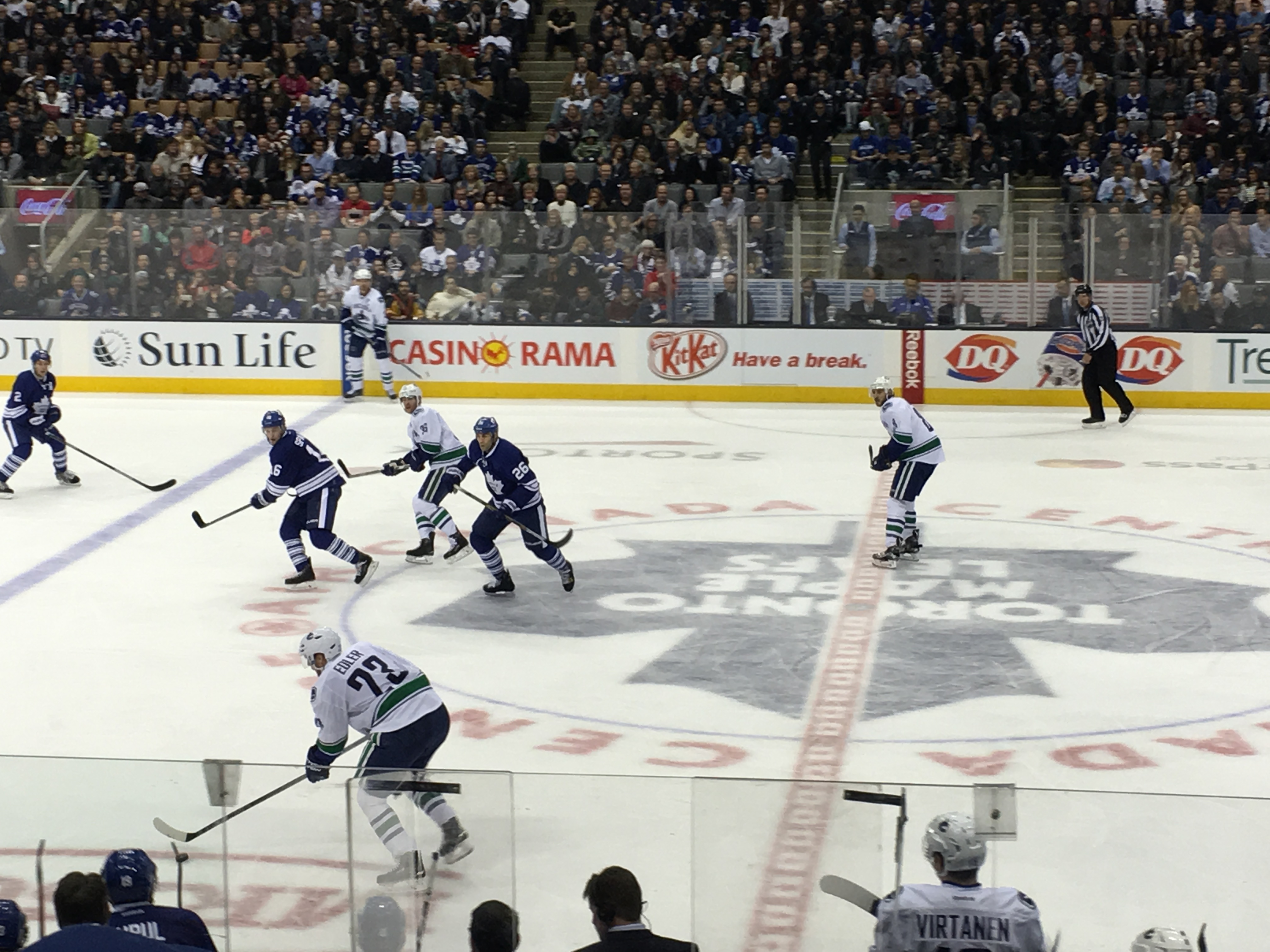 14日(土)は、2週間前に終わったばかりのGairdner賞の委員長をしているJohn Dirksご夫妻、現地の三菱電機の代表をしておられる二宮さんご夫妻、トロントで世界一ともいわれる肺移植の指揮を執っている安福先生、アジア太平洋財団のお世話をしているChris Nakamuraさんたちと昼食、いろいろな話題が出ました。夜は二宮さんのご友人と一緒にプロのIce Hokeyのゲーム観戦。ご当地のToronto Maple LeafsがVancouver Canucksを「4-2」で接戦を制し、みなさん大喜びでした。
