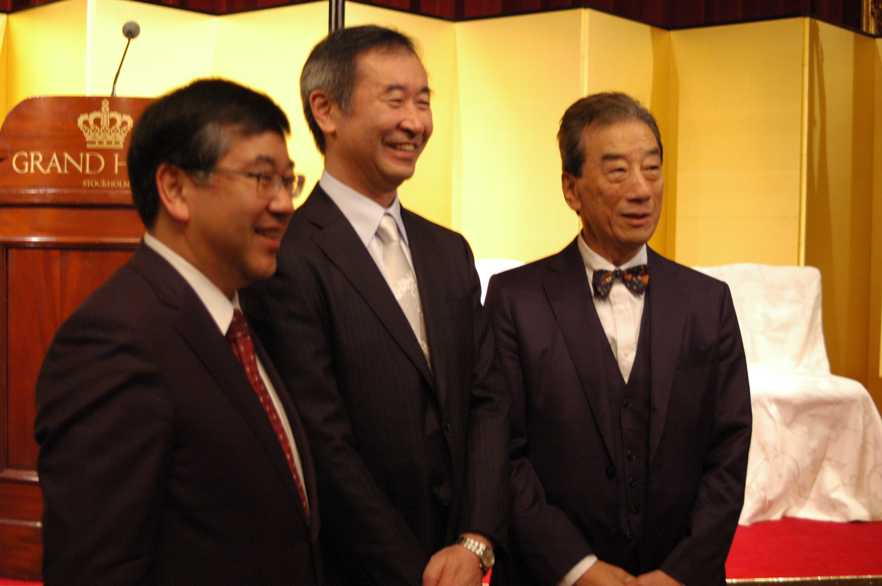 3人の受賞者の皆さんが30分ずつ、それぞれが晴れがましく、でも印象的な講演をされました。大村先生1)のスピーチは素晴らしいものでした。キャンベルさん1)の講演もいい話でした。トウさん1)は、ご体調のせいでしょう、座ったまま中国語で話され、そのパワポでは、図と英語の説明が並べられる配慮がされていました。