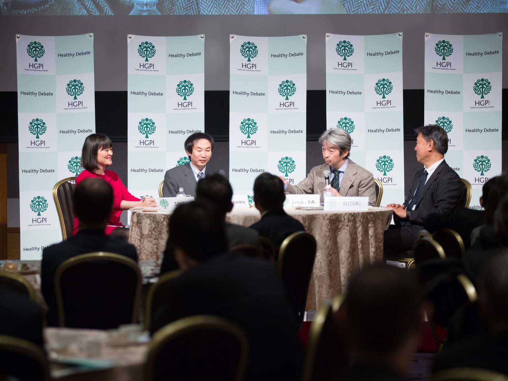第2部は「グローバルヘルス、G7サミットとその後」がテーマ。東大の論客、国際派の渋谷健司さん、厚生労働省審議官、これも国際派の鈴木康裕さん、JICAの米山芳春さん、そして司会はHGPIのアン・スミスさん。