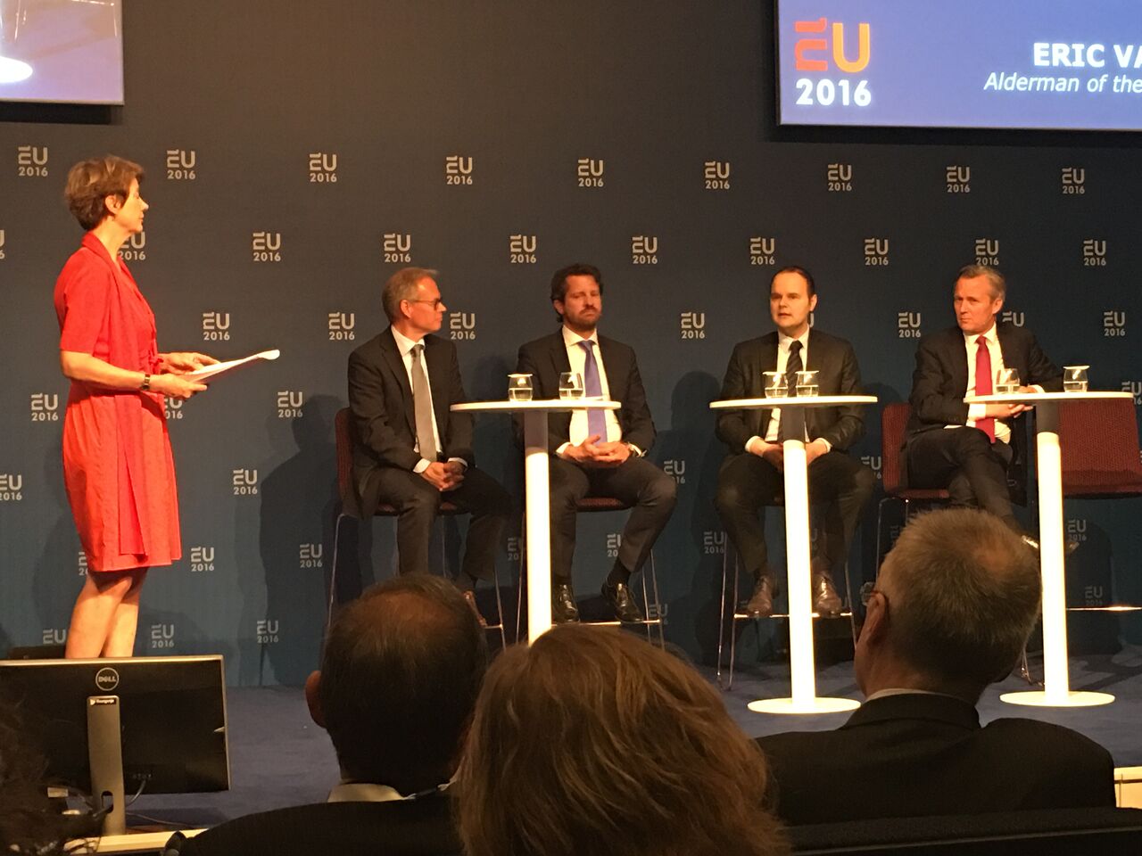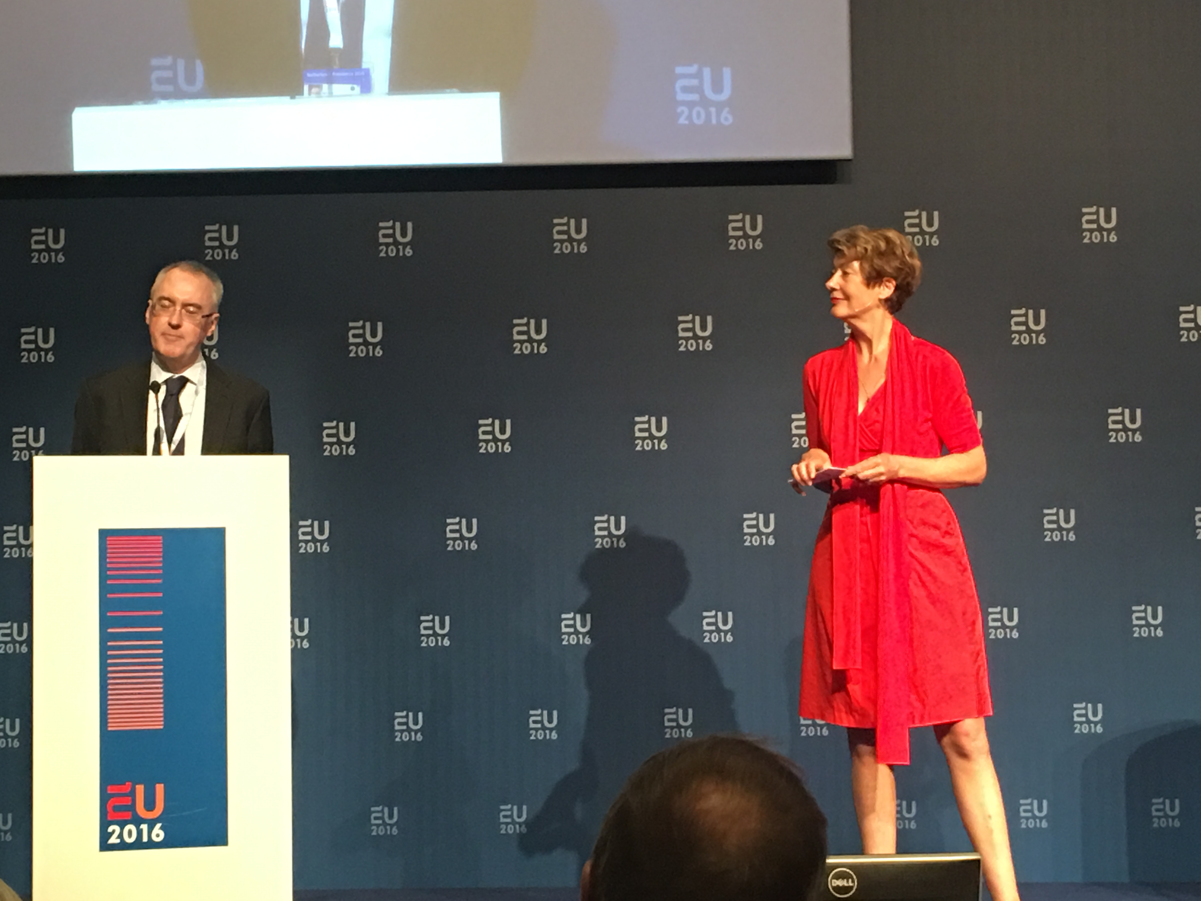 今回の会場はEU会館です。さすがにオランダですね。会場の設定も派手さはないですがプログラム自体はよく考えられていて、司会進行もそつなく進み、内容がとても充実していました。Martin van Rijnさんの講演に始まり、国会議員(Marijke Vosさん。写真の赤いワンピースの方です)の素敵な司会・進行でいくつかのパネルが進みました。なかなか勉強になる2日でした。
