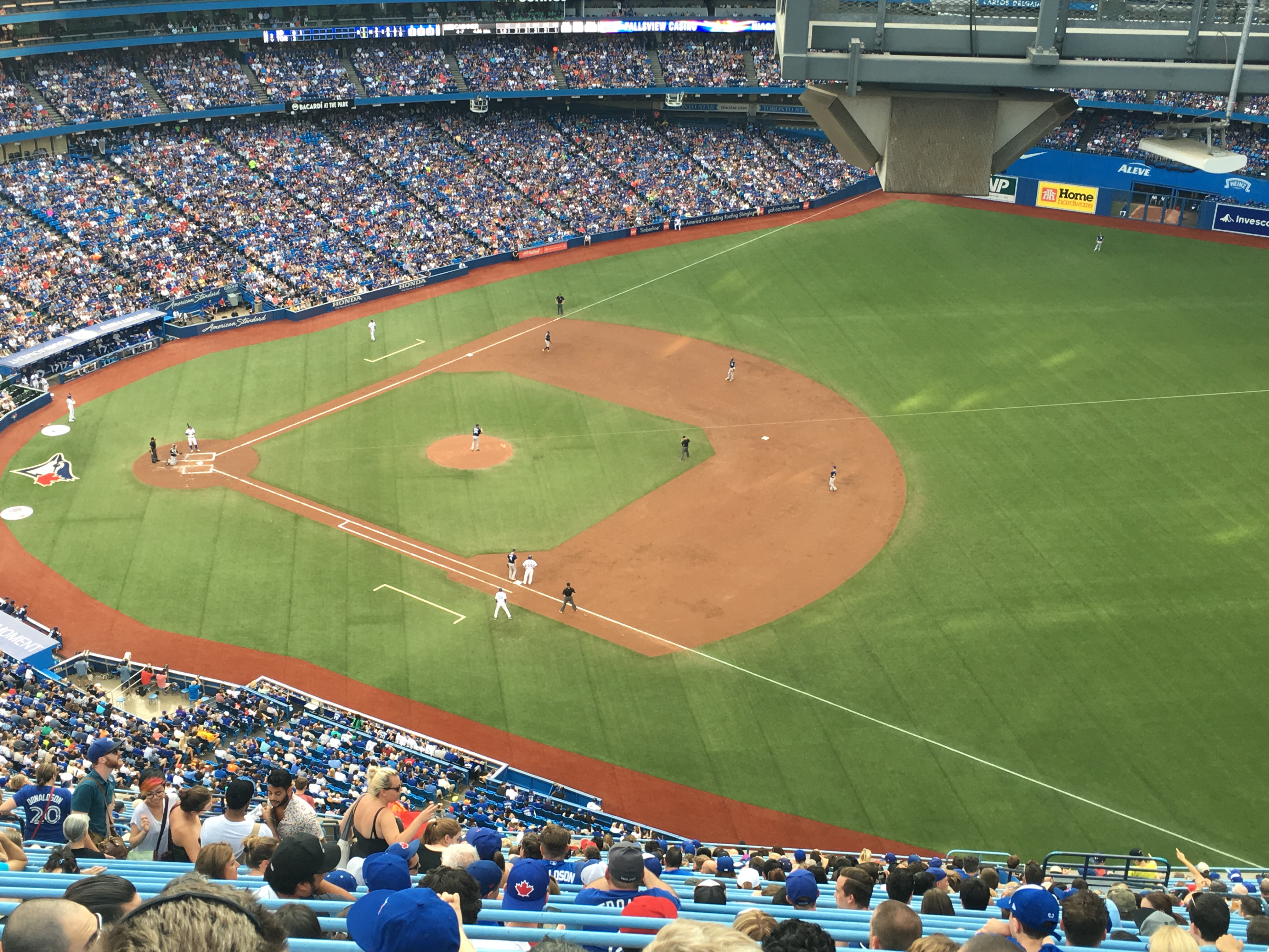 到着後ホテルにチェックインしてから、ご当地のToronto Blue JaysとSan Diego PadresのMLBゲームがあるので観戦に行きました。ほぼ満員の球場で、外野のかなり上の、急峻な場所の席しかありませんでした。私は7回の表で球場を後にしましたが、翌日の新聞を見ると、なんと12回までの延長戦、しかも12回表の2点差を”劇的な経過”で3点を取って勝ったサヨナラゲーム。みなさん大興奮だったと想像できます。